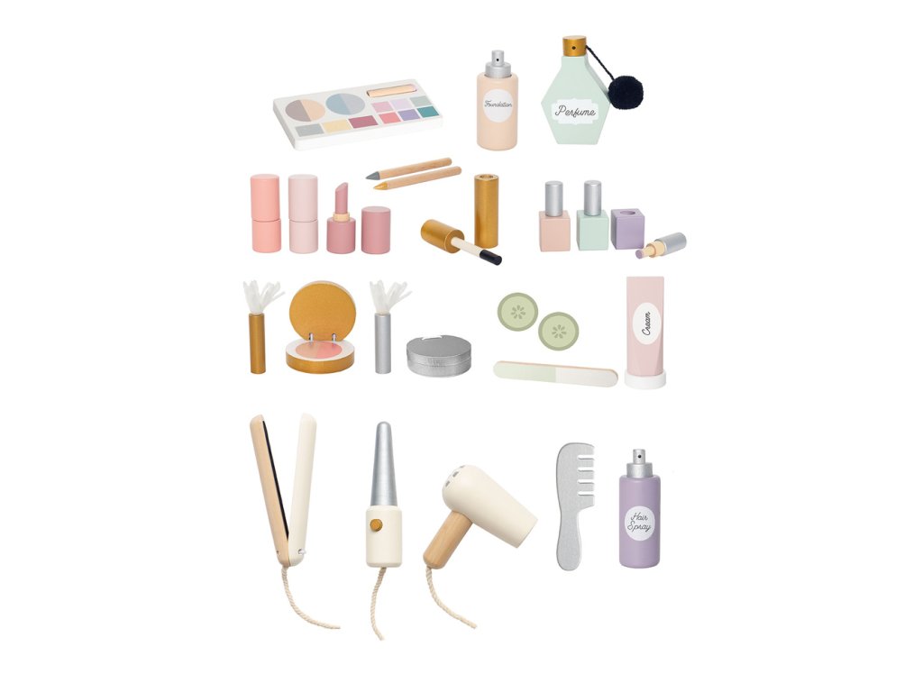Vitajte v skutočne luxusnom salóne krásy! Drevený beauty salón Jabadabado je plný všetkého, čo potrebujete na otvorenie vlastného salónu doma. Umožnite zákazníkom pohodlne sa usadiť v kresle a vychutnať si ošetrenie. Pomôžte zákazníkom s ich make-upom pred párty. Začnite pridaním plátkov uhorky na oči a naneste vrstvu krému na tvár skôr, ako začnete s make-upom. Naneste vrstvu podkladovej bázy a červeň na líčka. Akú farbu rúžu a očných tieňov preferujete? Finálnu bodku získate nanesením maskary a ceruzky okolo očí zákazníčky. Keď je make-up hotový, je čas postarať sa o vlasy. Upravte im vlasy pomocou fénu, žehličky alebo kulmy a potom ich upravte trochou fixačného laku na vlasy. Návšteva samozrejme končí exkluzívnym parfumom. Po dokončení ošetrenia sa zákazníčka môže pozrieť do zrkadla, aby videla krásny výsledok. Všetky doplnky sú vyrobené z dreva. Kozmetický salón má kolieska a rukovät, takže sa dá ľahko presúvať a na dvoch poličkách je možné uložiť všetok make-up a vlasové produkty. Súčasťou je celkom 26 rôznych luxusných doplnkov. Zaručene zabaví dieťa na celé hodiny. Podporuje tvorivé hranie rolí a iba predstavivosť určuje hranice, keď sa hra začína. Obsahuje: 1 x kozmetický salón so zrkadlom, 1 x hrebeň, 1 x sušič vlasov, 1 x žehlička, 1 x kulma, 1x lak na vlasy, 1 x základ, 2 x kefa, 1 x pilník na nechty, 3 x lak na nechty v rôznych farbách, 3 x rúž v rôznych farbách, 1x krém na tvár, 2 x plátky uhorky na priloženie na oči, 1 x maskara, 2 x štetec v rôznych farbách, 2 x paletky s očnými tieňmi ,2 x kajalová ceruzka, 1 x parfum. Rozmery produktu: 29 x 46 x 78 cm Rozmery balenia: 43,5 x 9,5 x 55 cm Materiál: čajové drevo, mdf, preglejka Upozornenie: Nevhodné pre deti do 3 rokov - Malé časti Bezpečnosť: Testované a certifikované podľa európskych noriemDoplňkové parametry