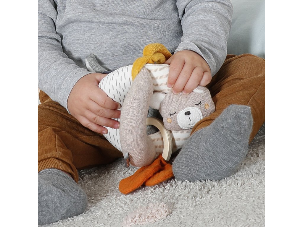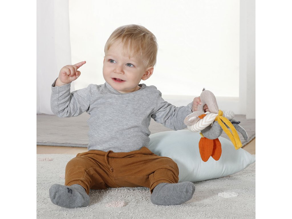 je také chrastítko a dřevěný kroužek pro podporu koordinace. Díky praktické