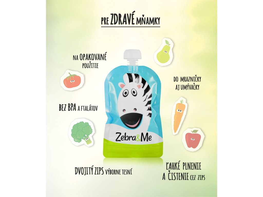 Naplňte obľúbeným kašovitým príkrmom, ovocným alebo zeleninovým pyré, smoothie, jogurtom alebo krémovým dezertom,... Použite znovu a znovu. Plniteľné kapsičky na opakované použitie Široký otvor so zipsom pre jednoduché plnenie a čistenie Možno umývať v umývačke riadu aj mraziť Neobsahujú BPA, PVC ani ftaláty, vhodné pre styk s potravinami, testované podľa noriem EÚ Ekonomická a ekologická alternatíva k príkrmom v jednorázových kapsičkách Objem cca 150ml Ideálne riešenie... von a na cestách. Žiadne lyžicky, žiadne tanieriky či poháre, žiadny neporiadok. Aj bez pomoci maminých rúk, jednoducho, samostatne a s radosťou. V aute, v lietadle, v parku, pri vode, v škôlke, na návšteve, či na nákupoch… kdekoľvek ste, Vaše deti si môžu užívať zdravé papanie z obľúbenej kapsičky. pri alergii / diétach. Domáce dobroty bez alergénov, prídavných látok a konzervantov môžete teraz dopriať svojim najmilším aj vo forme obľúbených kapsičiek. Takto viete presne, čo je vo vnútri a na tom záleží najviac. pri odmietaní stravy. Deťom sa kapsičky vďaka veselej grafike veľmi páčia. Sú nadšené keď sa môžu kŕmiť celkom samostatne bez pomoci. Ani ich nenapadne protestovať proti mrkvičke či špenátu vo Vašej dobrôtke. Teraz môžete mať plnú kontrolu nad nutričným príjmom svojich detí. pre zaneprázdnených rodičov. Nestíhate pripravovať domácu stravu každý deň? Pripravte viac porcií naraz a naplnené kapsičky dajte zamraziť. Budete tak mať pripravenú zdravú stravu na niekoľko dní, keď to naozaj budete potrebovať. Stačí kapsičku ohriať vo vodnom kúpeli. Čistenie:Umývajte ručne v teplej vode so saponátom, použite kefu na fľaše, vypláchnite čistou vodou a nechajte dôkladne vyschnúť. Pre umývanie v umývačke riadu odkrúťte vrchnák a nasuňte kapsičku otvoreným zipsom cez hroty horného koša umývačky. Plnenie:Uistite sa, že vrchnák je prikrútený. Kapsičku naplňte cez otvorený zips na spodnej časti použitím lyžice, lieviku, alebo jednoducho Vašu dobrotu do kapsičky nalejte. Vyvarujte sa horúcemu obsahu, mohli by ste sa popáliť. Aby ste zabezpečili bezchybné tesnenie, naplňte kapsičku len do cca ¾ obsahu a dôkladne uzavrite zips. Prejdite tlakom dvoch prstov ešte raz po celej dĺžke zipsu, aby ste sa uistili, že všetky drážky zipsu do seba zapadli.Naplnené kapsičky môžete použiť alebo zamraziť. Neprepĺňajte, obsah sa zmrazením zväčší.Pre ohrev stravy ponorte kapsičku do teplej vody. www.zebraandme.com www.facebook.com/ZebraandMe Doplňkové parametry