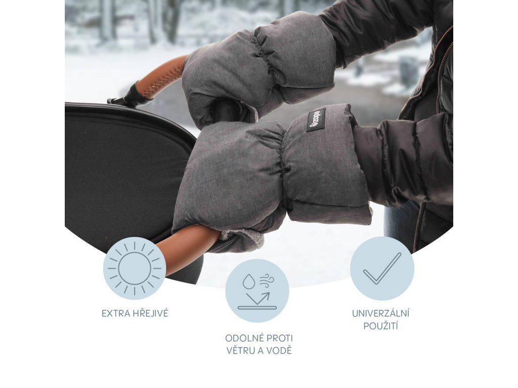 Univerzální hřejivé rukavice, které zabrání prochladnutí rukou v chladném období. Jednoduchá instalace pomocí druků. Vhodné jak pro kočárky se spojenou rukojetí, tak pro golfové kočárky. Větru a vodě odolný materiál.